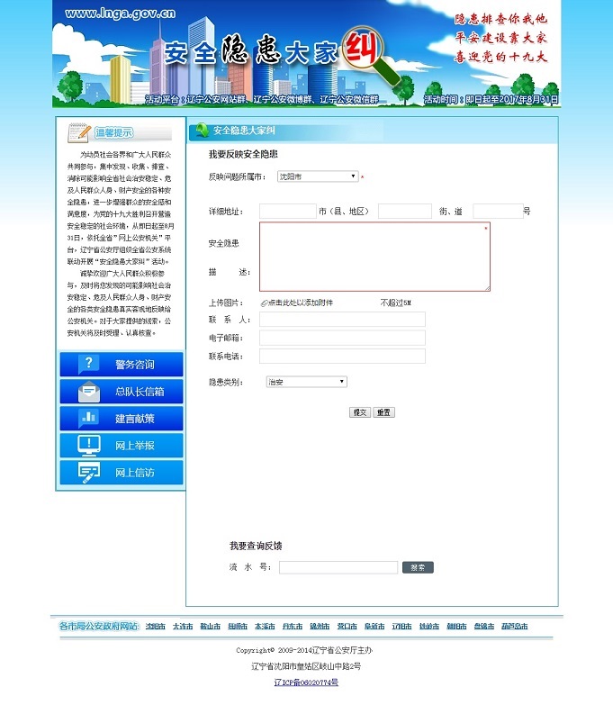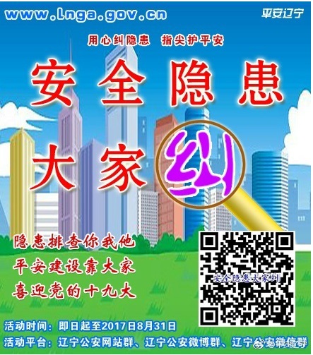 為深入貫徹落實習近平總書記系列重要講話精神,充分發(fā)揮全省“網上公安機關”平臺作用,遼寧省公安廳從即日起至8月31日,組織全省公安機關依托各級公安政務網站、公安政務微博、公安政務微信平臺,集中開展“安全隱患大家糾”活動,全面開啟遼寧公安“查患治患”工作的“互聯網+”模式。