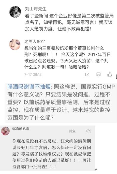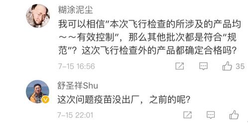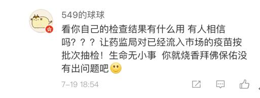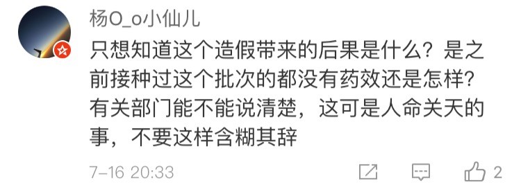 網(wǎng)友“楊O_o小仙兒”表示:“只想知道這個(gè)造假帶來(lái)的后果是什么?是之前接種過(guò)這個(gè)批次的都沒(méi)有藥效還是怎樣?有關(guān)部門(mén)能不能說(shuō)清楚,這可是人命關(guān)天的事,不要這樣含糊其辭。”