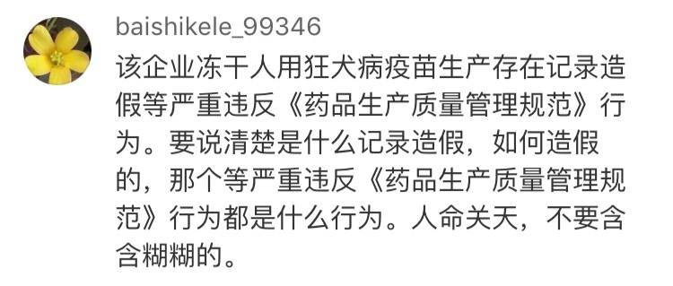 網(wǎng)友“baishikele_99346”認(rèn)為:“要說(shuō)清楚是什么記錄造假,如何造假的,那個(gè)等嚴(yán)重違反《藥品生產(chǎn)質(zhì)量管理規(guī)范》行為的都是什么行為。人命關(guān)天,不要含含糊糊!