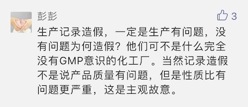 也有網(wǎng)友認(rèn)為:“生產(chǎn)記錄造假一定是生產(chǎn)有問(wèn)題,沒(méi)問(wèn)題為什么造假?他們可不是沒(méi)有GMP意識(shí)的化工廠。當(dāng)然記錄造假不是說(shuō)產(chǎn)品質(zhì)量有問(wèn)題,但是性質(zhì)比問(wèn)題更嚴(yán)重,這是主觀故意。”