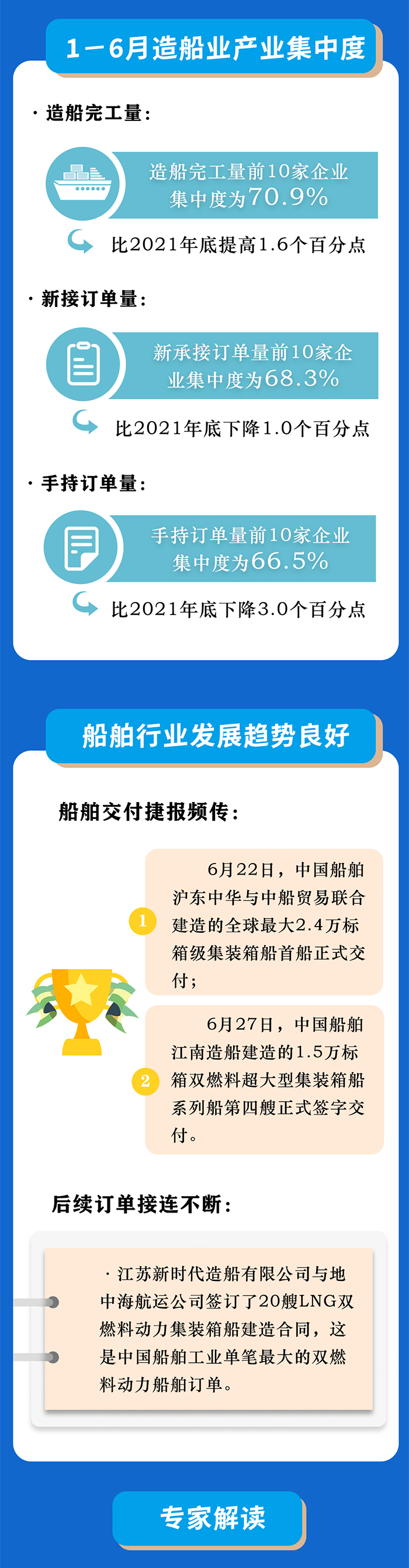 “上半年中國(guó)船舶工業(yè)克服不利影響,主要指標(biāo)繼續(xù)保持世界第一,這是一個(gè)了不起的成績(jī)。”中國(guó)船舶工業(yè)行業(yè)協(xié)會(huì)秘書長(zhǎng)李彥慶在接受人民網(wǎng)“強(qiáng)觀察”欄目記者采訪時(shí)表示,上半年我國(guó)船舶工業(yè)呈現(xiàn)出五方面特點(diǎn):一是接單的船型結(jié)構(gòu)不斷優(yōu)化。從以散貨船和油船等傳統(tǒng)船型為主,到現(xiàn)在散貨船、油船、集裝箱船、氣體船、客船以及特種船舶均衡發(fā)展。二是重點(diǎn)船型加速突破,新型裝備不斷涌現(xiàn)。今年上半年,大型LNG運(yùn)輸船成交30艘,創(chuàng)造歷史新記錄;汽車運(yùn)輸船市場(chǎng)份額穩(wěn)居世界第一;海上風(fēng)電安裝船、深遠(yuǎn)海養(yǎng)殖裝備等新型海洋裝備實(shí)現(xiàn)批量接單。三是手持訂單不斷增長(zhǎng),為加快轉(zhuǎn)型升級(jí)奠定堅(jiān)實(shí)基礎(chǔ)。當(dāng)前,國(guó)內(nèi)大部分企業(yè)訂單已能滿足2~3年生產(chǎn)量,基本解決了持續(xù)生產(chǎn)經(jīng)營(yíng)的問題。四是產(chǎn)業(yè)結(jié)構(gòu)日趨合理,“專精特新”發(fā)展理念逐步深入。五是跨行業(yè)融合發(fā)展的“產(chǎn)業(yè)生態(tài)體系”逐步建立。
