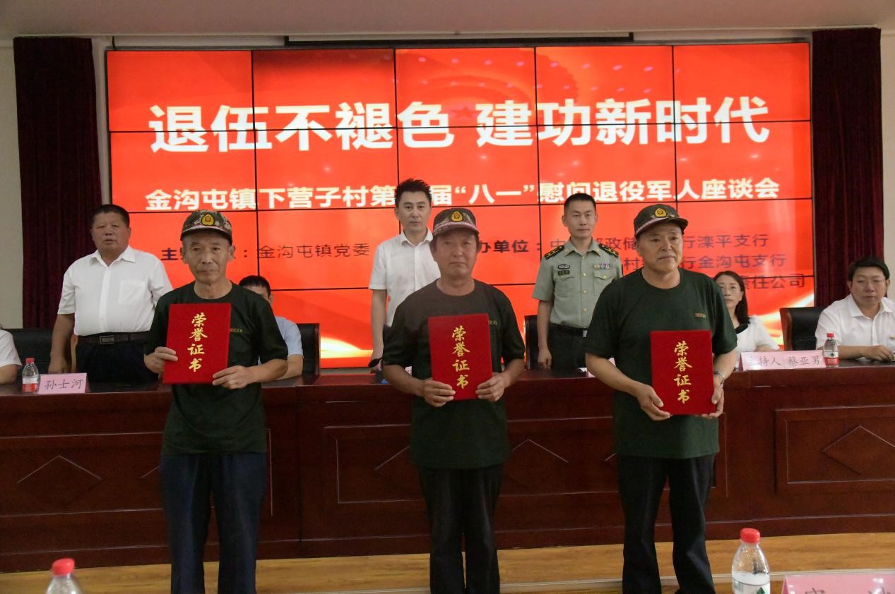 8月1日下午,灤平縣金溝屯鎮(zhèn)下營子村聯(lián)合愛心企業(yè)中國郵政儲蓄銀行灤平支行、灤平盛陽村鎮(zhèn)銀行金溝屯支行和承德久財農牧開發(fā)有限責任公司共同舉辦了“退伍不褪色 建功新時代”第二屆“八一”慰問退役軍人座談會;顒蝇F(xiàn)場,大家歡聚一堂,共同慶祝中國人民解放軍建軍95周年,共敘魚水深情,并為優(yōu)秀退役軍人頒發(fā)榮譽證書。 王海琦 郎朗 攝