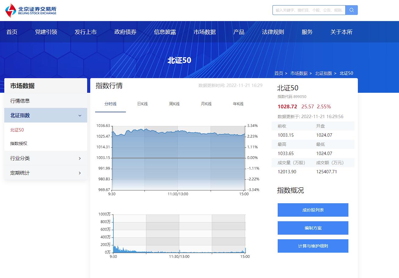 北交所首個(gè)指數(shù)——北證50成份指數(shù)(簡(jiǎn)稱北證50)于11月21日正式發(fā)布實(shí)時(shí)行情。上線首日,北證50收盤上漲2.55%,報(bào)1028.72點(diǎn),開盤后走勢(shì)平穩(wěn),樣本股成交活躍,提高了整個(gè)市場(chǎng)活躍度。據(jù)了解,北證50以2022年4月29日為基日,基點(diǎn)為1000點(diǎn)。