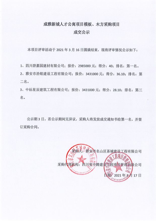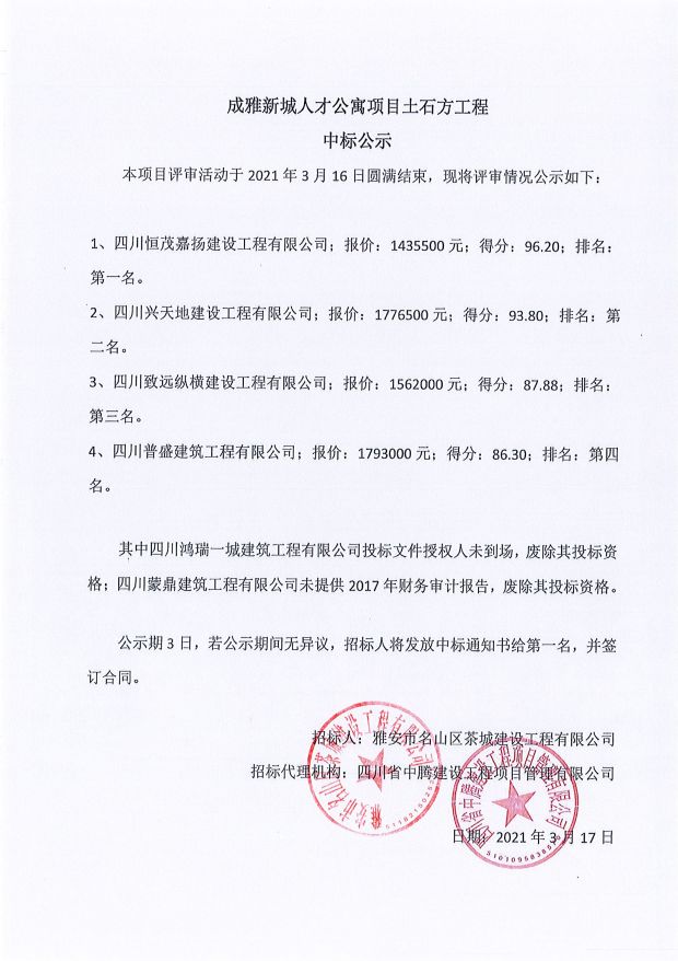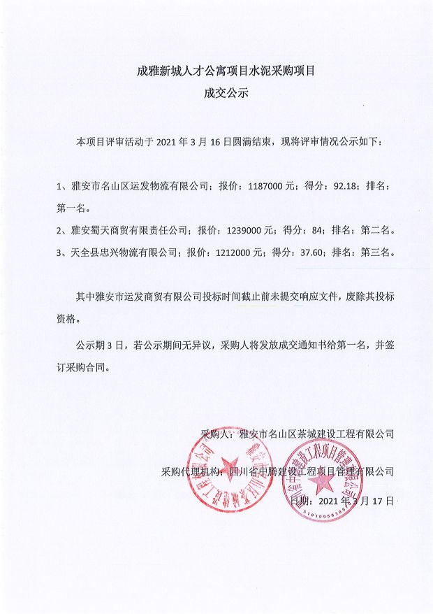 成雅新城人才公寓砂石、塔機(jī)租賃、土石方、鋼材、管架租賃、模板木方、水泥采購項(xiàng)目成交公示