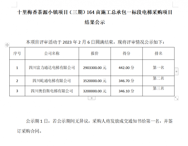 十里梅香茶源小鎮(zhèn)項(xiàng)目(三期)164畝施工總承包一標(biāo)段電梯采購項(xiàng)目 結(jié)果公示